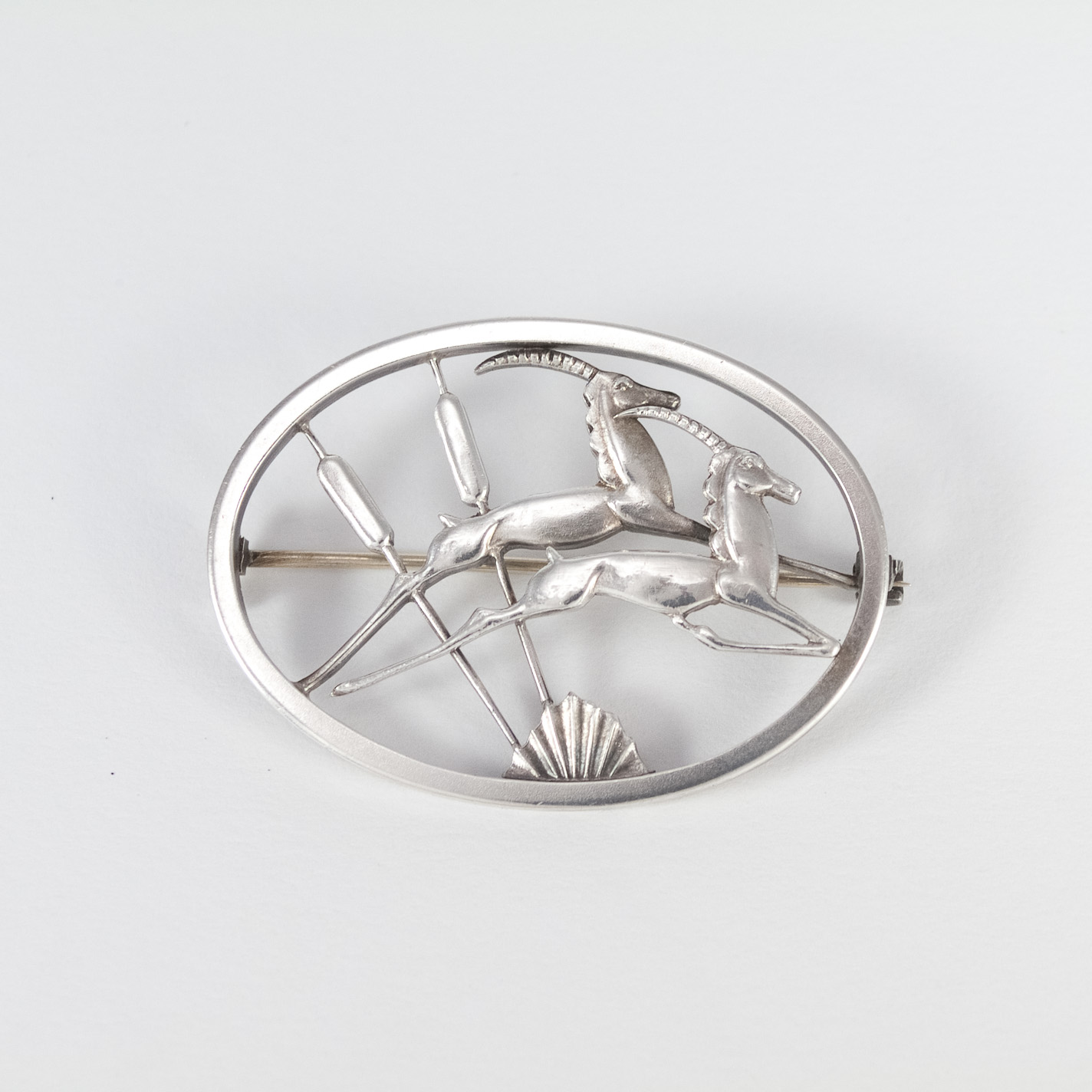 Sterling silver oval brooch of two leaping gazelles designed by Geoffrey Bellamy, similar in style to a George Jenson Deer brooch, with equally impressive silver open work. With engraved facsimile signature of Geoffrey G Bellamy (an increasingly collectable British designer and silversmith).